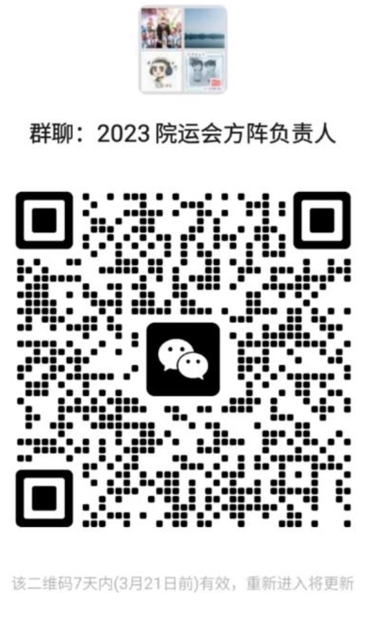 7.方阵组队研究生以研究所为单位,本科生以专业为单位进行组队,参与人员需为教师、学生共同参与,其中方阵引导人需为教师,请各研究所、专业指定1人为方阵负责人并于3月20日21点前扫描下方二维码进入“2023年彩霸王 运动会方阵负责人群”(建议方阵负责人与赛事负责人不兼任)。方阵表现与精神文明奖评比挂钩。