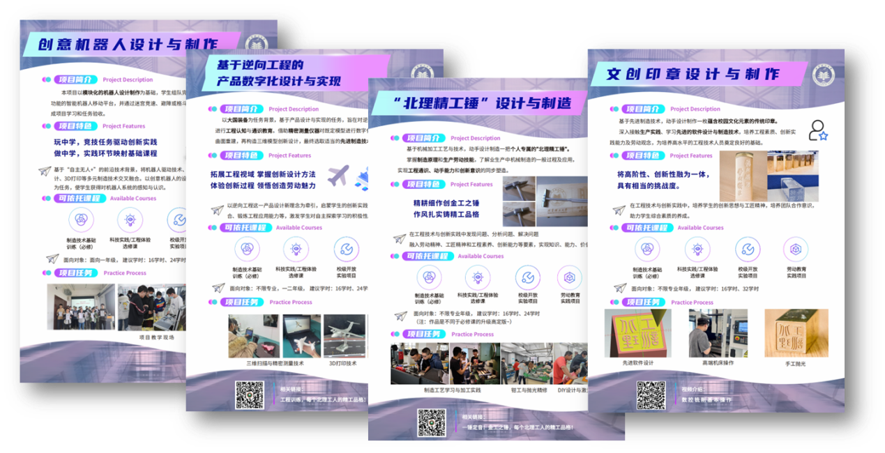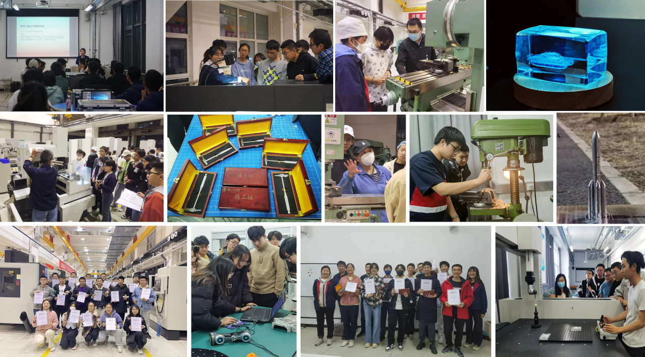 全体同学根据项目任务自由组队,3-5人为一组,在小组导师的带领下分别按照项目任务书完成既定的设计与制作任务。课程内容设计中串联了二维图纸与三维模型设计、机械加工技术实践、数控加工编程实践、特种加工技术体验等多个工程基本素养锻炼模块。同学们综合运用多种现代设计制造技术与传统加工工艺,体会“自主设计、智造万物”的魅力。此次系列实践项目一方面旨在拓展工程视域,使学生在专业知识面上获得基本工程认知,感受现代设计制造技术与传统工程美学在碰撞间迸发的魅力,另一方面也使学生掌握研究性学习所需的创新设计方法、全面体验创新制作全过程,在精工细作中的体悟工匠精神和创造性劳动的成就感。