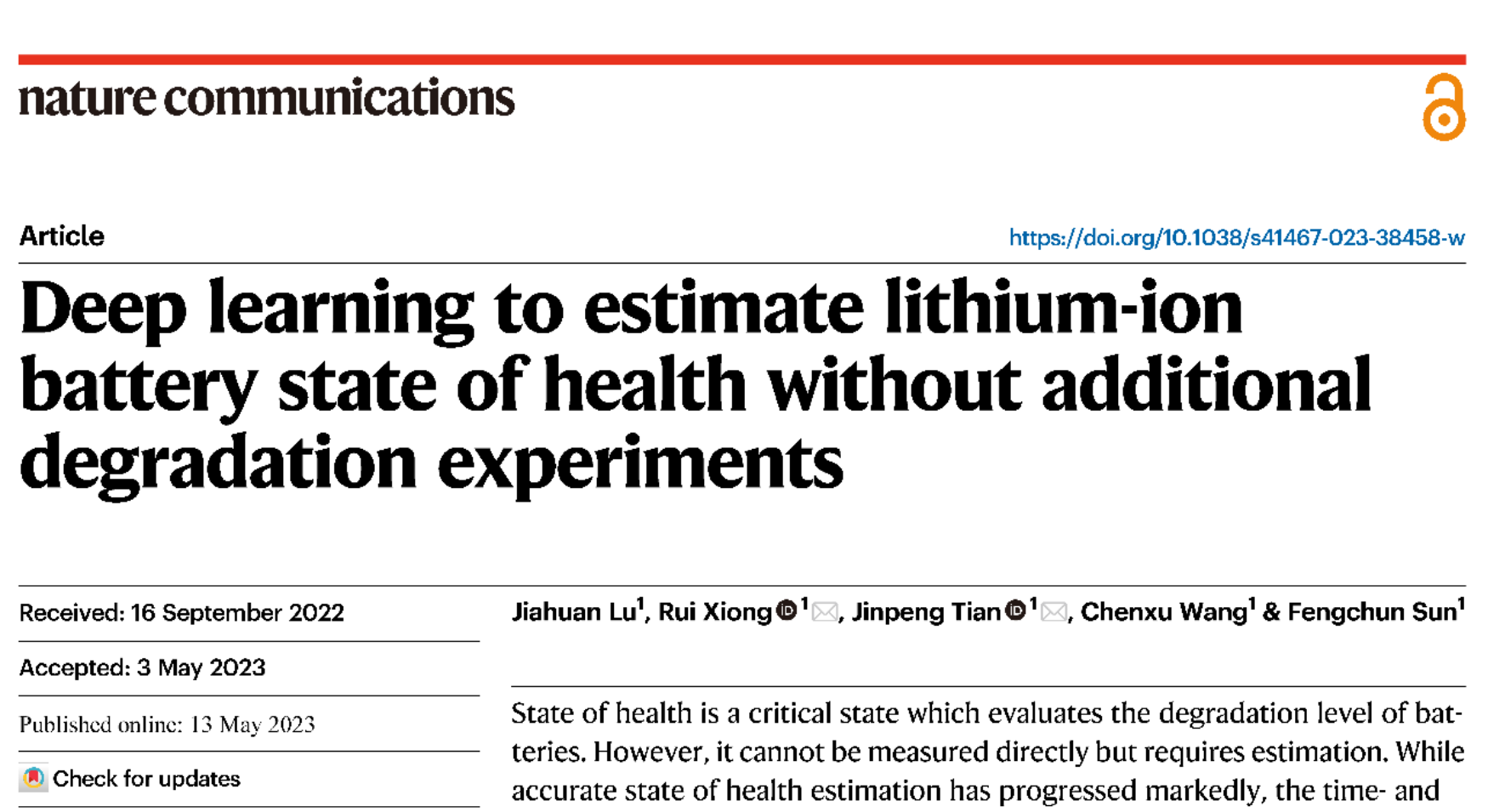 近日,北京理工大学电动车辆国家工程研究中心孙逢春院士、熊瑞教授团队在《自然通讯》杂志上发表论文“Deep learning to estimate lithium-ion battery state of health without additional degradation experiments”,提出了不依赖额外电池老化测试的健康状态快速评估方法。该方法直接利用已有电池数据实施新电池健康状态评估,打破了电池健康状态评估对完备测试数据的依赖性。