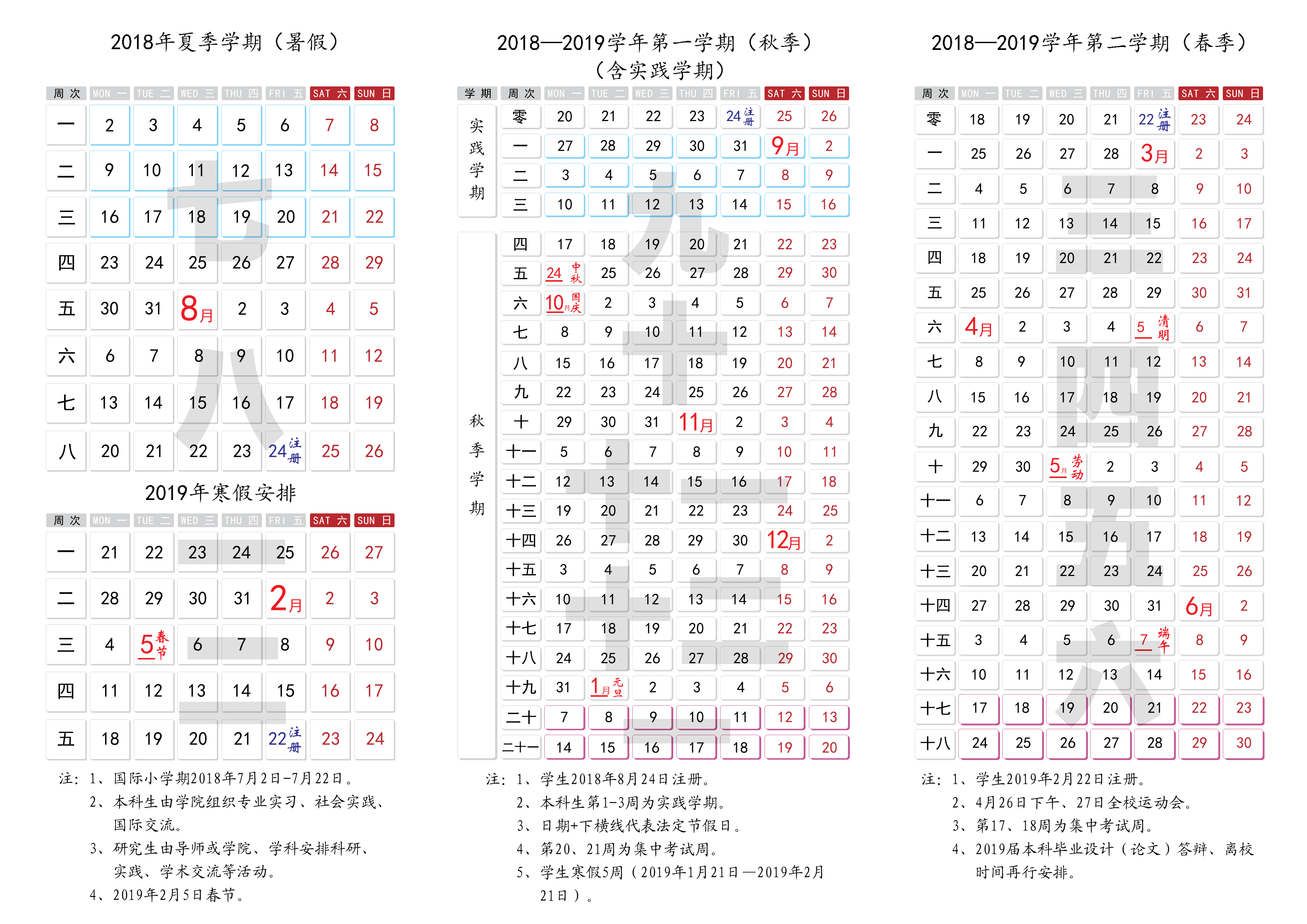 2018-2019学年第一学期教学日历